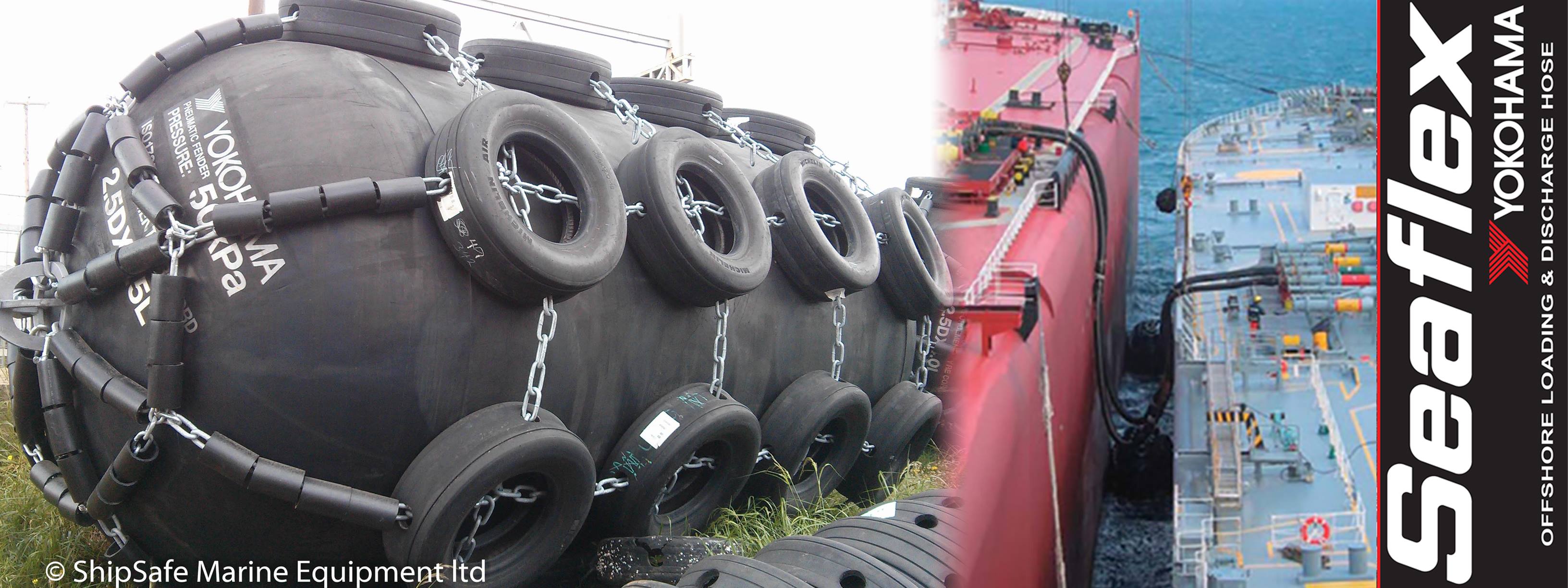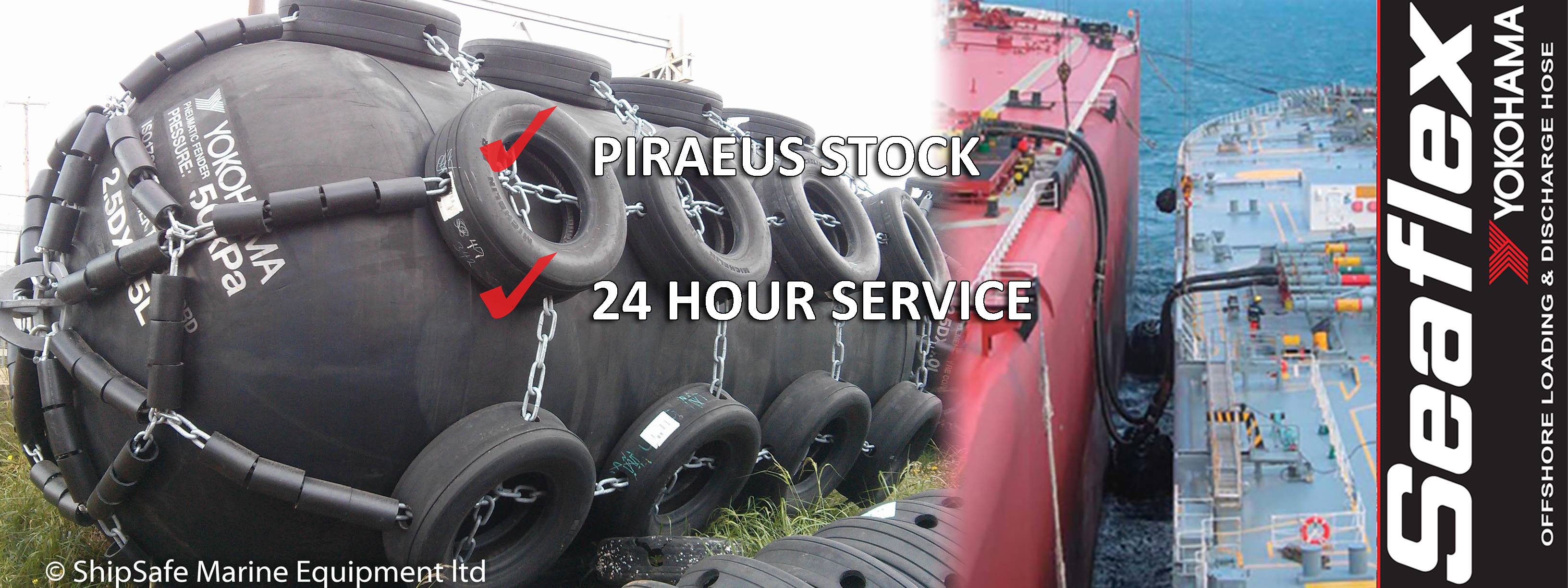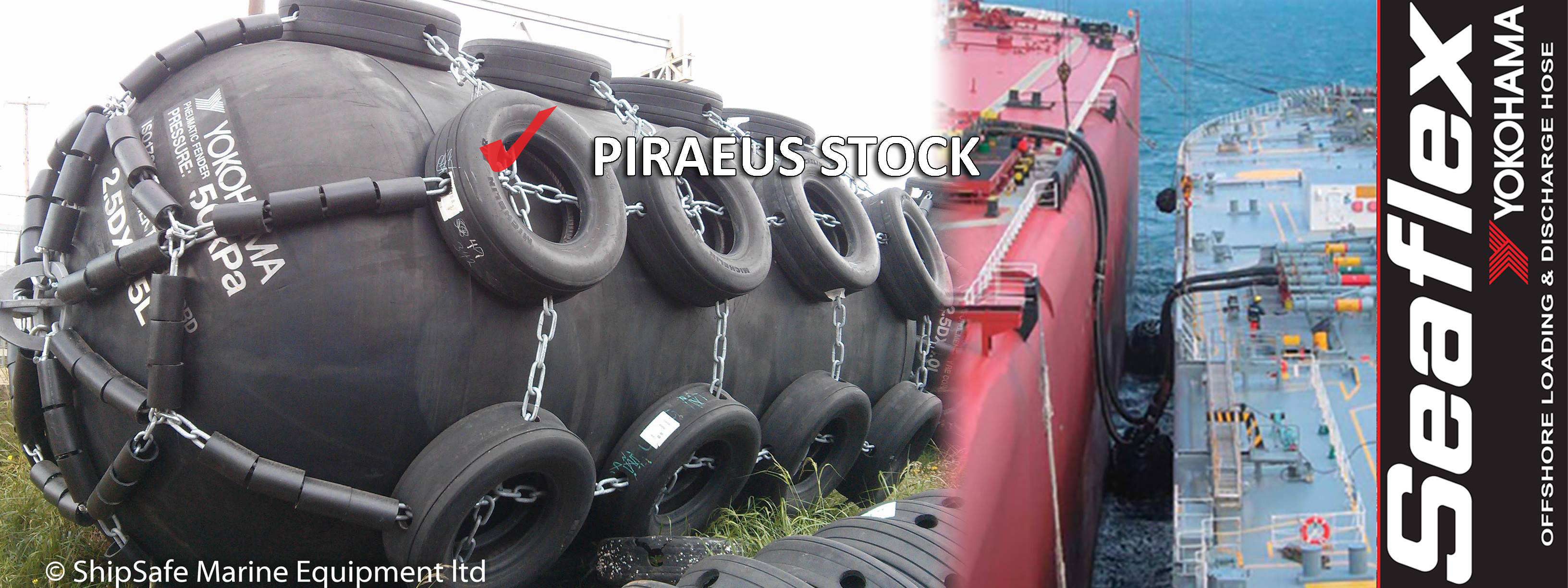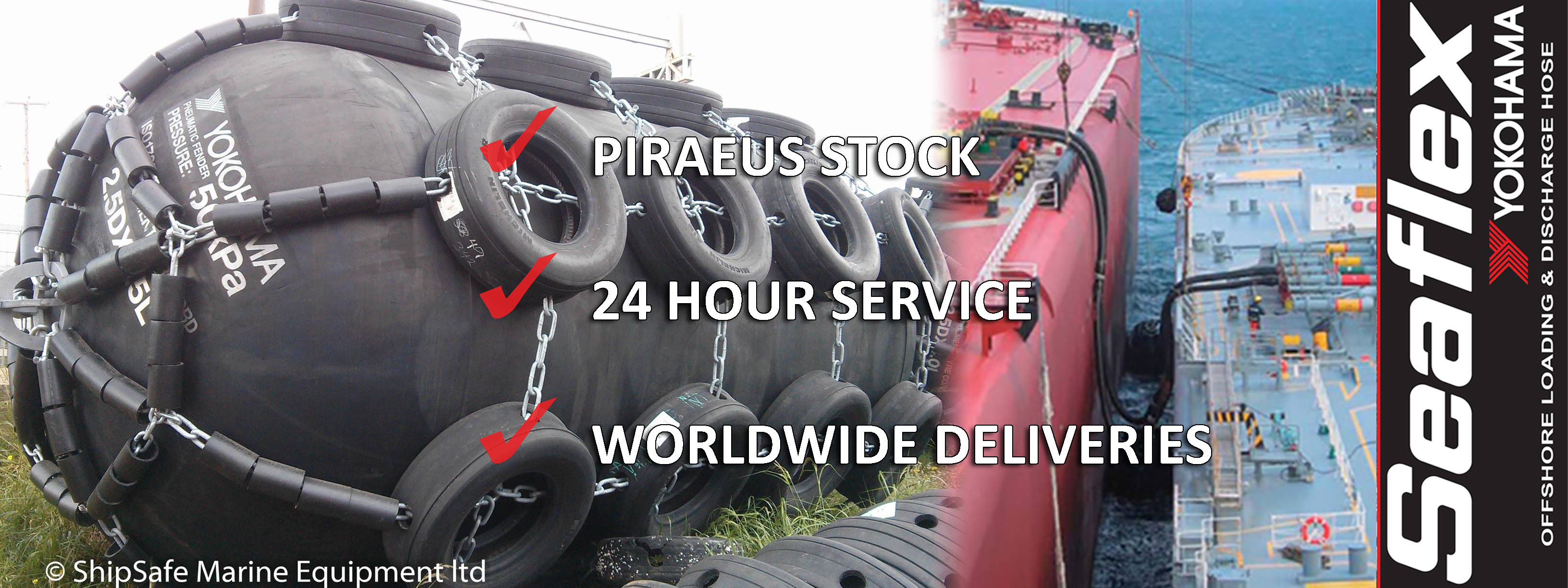 “ ShipSafe Marine Equipment ltd. ” Keeps the biggest stock of " Yokohama Rubber Fenders " and " Seaflex "Hoses in Europe and supplies, from its warehouse in the Piraeus port area, Yokohama fenders of sizes from 0.5m diameter up to 3.3m and of lengths from 1.0m up to 6.5m, high strength fender protection nets made of chains and aircraft tires for long life.